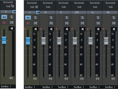The individual channels of a Surround bus are normally hidden, by clicking on Sub >> they can be displayed. If you disable the link button , you can also set the channels separately.