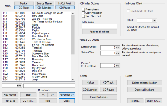 Create: Using the corresponding buttons you can create markers, CD tracks, CD sub indices or CD pause indices. The index is created at the current play cursor position, its position can then be changed in the time input field.
