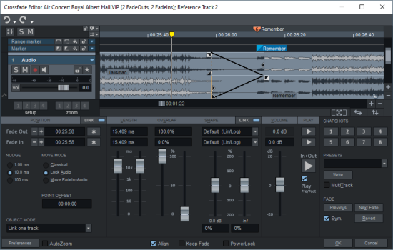 The Crossfade Editor provides you with a powerful tool for editing crossfades between objects. All functions can be executed with the mouse as well as with the keyboard.