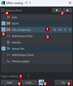 The effect routing dialog lists all effects used in the respective context (track, object or master), as well as the possible positions for routing the signal to an AUX send/Submix bus, master or hardware output. This allows you to configure the order of effects and positioning of the track's outputs.