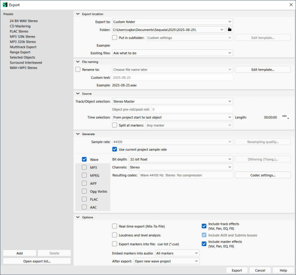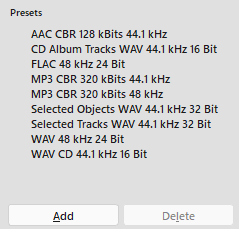 In the ExportIn this dialog all aspects of an export like used tracks, time selection, file formats... can be set very flexibly. dialog, all aspects of an export such as tracks used, time sections, file formats... can be set very flexibly That's a lot of parameters, so all the settings made in the dialog can be saved together as a preset for later use, so you don't have to start from scratch every time.