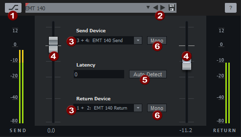 With Auto-Detect you measure the total latency ("round-trip") of the effect, which consists of the latency of the inputs and outputs as well as the latency of the effect device itself. It is used for latency compensation during recording and playback, so that the effect is applied sample-accurately. When you click this button, a short pulse (ping) is sent to the effect device and the time delay with which it arrives at the effect input is measured.