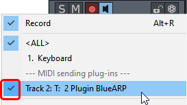 Select a plug-in's MIDI output as an additional track MIDI input by right-clicking the track's Record button and activating it at MIDI Sender Plug-ins.