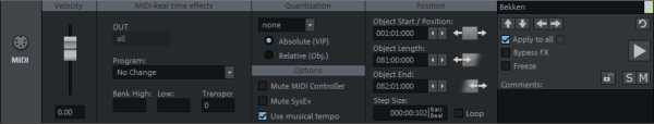 MIDI real-time effects: With these settings the output of the MIDI objects can be changed in realtime, that means settings here do not change the data of the MIDI object: