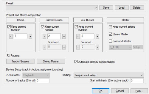 Tracks, submix busses, AUX busses: The option Keep current number works both when saving and loading presets. It is initially activated for tracks, buses and AUX buses. Only if you change one of these numbers, it will be deactivated and only these changes will be included when saving a preset. For example, if you load the "4 Busses + 4 AUXes" preset, the number of tracks will not be changed, because the number of tracks is not included in the preset.