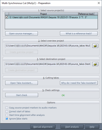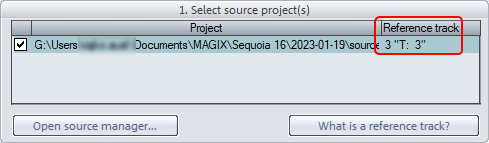 The reference track is the track that is selected in the source project at the moment when the analysis is started and the overview project is created. At the top of the Multi-synchronous cut preparation dialog, in the list of source projects, you can see which track is set as the reference track in the Reference Track column for each source project.