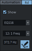 In the lower section of the menu Both drop-down menus open the automation menu. When automating effect parameters, the upper menu displays the effect and the lower menu displays the parameter. Now switch to the mouse mode Draw Automation using the button below and draw the parameter changes directly onto the object with the pen. To switch between displaying track and object automations, you can also use the Show checkbox at the top of the Automation section. |
