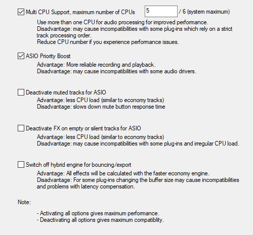 Deactivate muted tracks for ASIO: With this option you reduce the CPU load of your system. However, there are short delays when switching off mute.