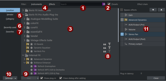 Add: Loads the selected effect or instrument into the effect chain, opens its interface and closes the plug-in browser. The opening of the effect dialog and the closing of the plug-in browser after adding the plug-in can be deactivated with the respective option. In the menu at Add or by using additional buttons, you can also access two special forms of adding: