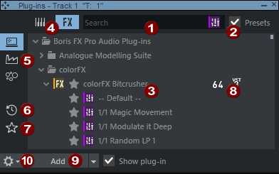 Plug-in list: In the list, all plug-ins and optionally their presets are listed in a tree structure, depending on the setting at (5). Use the arrow keys to move around the list to select an item. Use the Enter key to open and close a folder. Ctrl + left arrow collapses the entire tree, Ctrl + right arrow expands the entire tree. If a plug-in or one of its presets is selected, you can add it by pressing Enter (see below). Alternatively, you can also move the mouse over a list entry and click on the plus symbol |