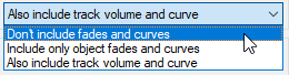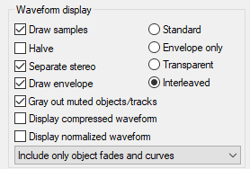 In this menu, you select how the waveform display is scaled by the object fade-in/out and by the volume curves (track/object). In the preset mode Include only object fades and curves, the waveform is only scaled by the object fades and, if applicable, by object volume curves. With Also include track volume and curve the track volume or its automation curves are also included. This corresponds to the previous option Scale with fades/curves. This scaling makes, for example, the decay of the sound during a fade-out visible as well as volume changes by a volume curve. Even with crossfades, this mode provides a good visual evaluation of the resulting audio signal.