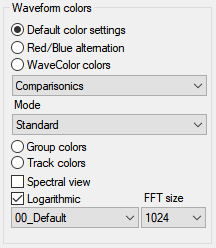 Various settings can be found in the drop-down menu below: The default setting applies intense rainbow colors to the audio signal. The Comparisonics preset provides coloring similar to the Comparisonics color display of older versions of Sequoia. Black & White - Pitch and Black & White - Noise Factor displays only the pitch or noise component in grayscale.