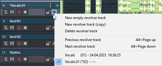 In the lower part of the menu you can directly select the different revolver tracks. Use the keyboard shortcuts Alt + Page Up / Alt + Page Down (Previous revolver track/Next revolver track) to switch between revolver tracks.