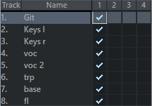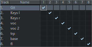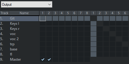In the rows all tracks are displayed, in the columns the hardware outputs, followed by the tracks and the master. In the above illustration, all tracks are routed to the master.
