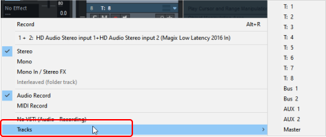 It is also possible to record the output of a track, a bus or the master on a track. To select the output of a track as the source for audio recording, right-click the Record button in the Track Head, Track Editor, or Mixer, or click the Input button in the Audio section of the Track Editor, or at the very top of a mixer track, to open the Track Input menu.