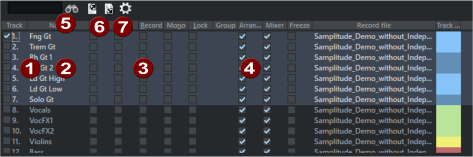 The track manager displays all tracks contained in the current project and allows direct access to various track properties such as "Solo", "Mute" and "Record" as well as hiding tracks in the project window or mixer.