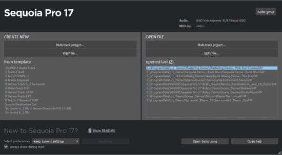 Below are useful options for getting started working with Sequoia with access to the demo song and help.