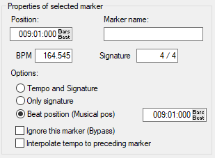 Time signature: A time signature can be assigned to each tempo marker. If you switch to Only signature at Options, the current tempo marker becomes a Time signature marker.