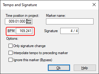 The grid position marker is set without opening the Tempo and Time signature dialog. The option Interpolate tempo to previous marker in the dialog is enabled by default, since it is assumed that continuous tempo variations will be captured with the input of grid position markers.