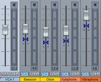 VCA is the abbreviation for Voltage Controlled Amplifier. These are used in analog mixing consoles. A fader no longer directly controls the level of a channel, but only a control voltage, which in turn adjusts a mixer channel via a voltage regulator (VCA). Since one control voltage can also be used to control several VCAs, the level of several channels can be adjusted together via a VCA group.