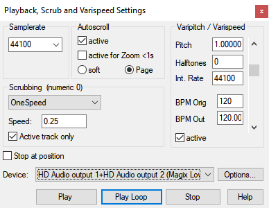 In addition to the Varispeed function, this dialog also provides access to important other playback settings such as scrub control, autoscroll or the standard output device.