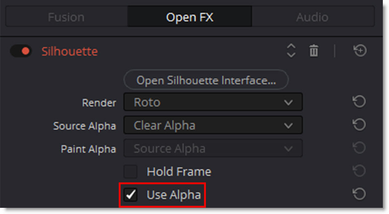 To use the alpha channel created by Silhouette in Resolve, a specific workflow is required.