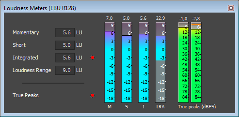 The Loudness Meters tool provides data about an audio file's momentary loudness, short-term loudness, integrated (overall) loudness, and loudness range. You can use these values when mastering for broadcast to ensure compliance with loudness standards (such as the CALM Act).