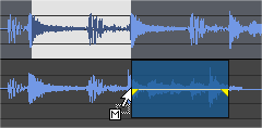 3. Drag the selection to the location where you want to mix the data. The cursor is displayed as a , and a shaded selection box is displayed to show you where the mix will occur. An envelope is drawn to show you the mix and fade levels (the last-used settings from the Mix/Replace dialog are used by default).
