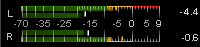 Outside: PPM with DIN scale (non-linear, -70...9dB) with delay-free rise Inside: VU meter with working range (yellow) [-14; 0] |