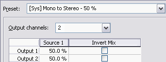 From the Process menu, choose Channel Converter to change the number of channels in an audio file. The Channel Converter dialog can also be used to reverse the channels of a stereo file or intermix the channels of a multichannel file to create interesting panning effects.