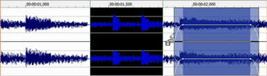 When this check box is selected, the Fade In and Fade Out settings for the Mix tool will pay attention to the destination selection and file length when mixing between files. In the following example, notice how the Fade in and Fade Out curves are adjusted when we drag a selection from one data window to another and move the selection through an existing selection in the destination window: