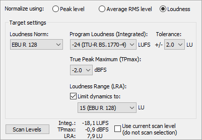 For the Loudness Norm you can choose either EBU R128 or ITU-R BS.1770/1771 in their respective current versions. Accordingly, the target values in LUFS are set for the integrated program loudness with corresponding tolerance range in LU and the maximum true peak value (TP max).