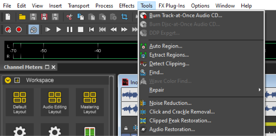 The classic Sound Forge Pro restoration plug-ins, which have been tried and tested for many years, can be accessed in the Tools menu via the corresponding commands