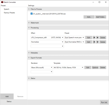 Add the files you want to process in the Files to Process section on top of the settings. All data windows that were open in the Sound Forge Pro workspace when you started the Batch Converter are automatically included in the list. You can un-check specific files to exclude them from processing.