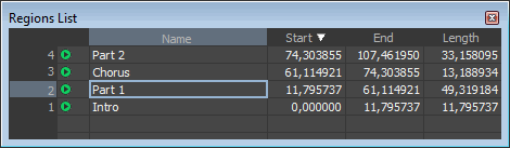 From the View menu, choose Metadata, and then choose Regions List to open or close the Regions List window. The Regions List contains all regions and markers that exist in the active data window.