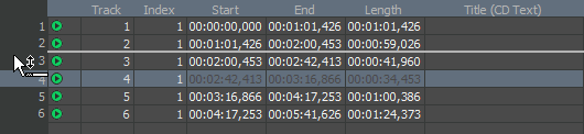 The Track List window is essentially a text representation of the events on the CD layout bar for a disc-at-once CD. You can use the Track List window to view track and index markers, edit track position and length, edit track names, adjust pause time, toggle protection and emphasis flags, and edit ISRC data.