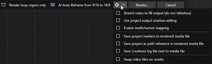 Render options & estimate | Open the gear menu and toggle options such as Render loop region only; the Estimated size updates as you change templates and settings (see Rendering your project). |