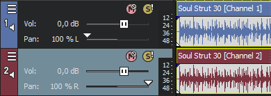 The audio events are grouped, and tracks that are created by adding media will be panned hard left and hard right. You can select an event and choose Edit | Channels to choose which channel is used for that event. You can use this feature when working with two-channel source media that contains two distinct audio channels, such as an interview in which channel 1 contains the interviewer's voice and channel 2 contains the subject's voice. When the checkbox is cleared, two-channel audio files will be opened as a stereo pair on a single track: