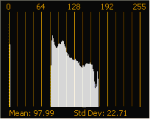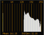 Contrast decreased with a contrast center of 1.0: the histogram is squeezed into a narrower portion of the spectrum anchored at the right edge of the graph.