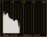 Contrast decreased with a contrast center of 0.0: the histogram is squeezed into a narrower portion of the spectrum anchored at the left edge of the graph.