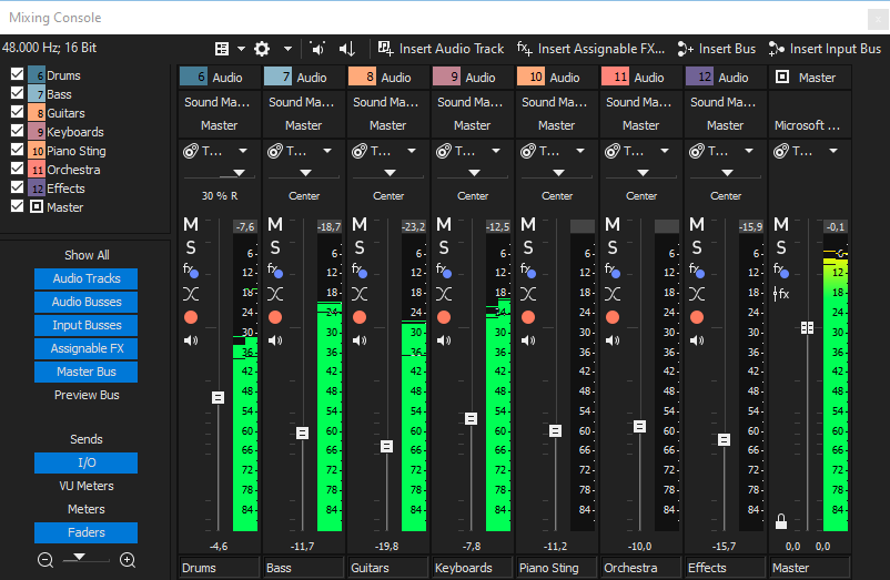 The Mixing Console window provides an integrated view of all tracks and busses in your project using the appearance of a traditional hardware-based mixer.