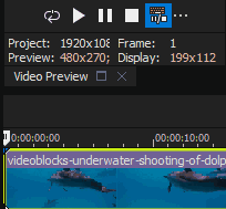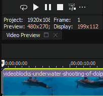 Displays the frame size, color bit depth, and frame rate that will be used for previewing. Right-click the Video Preview window and select Display at Project Size if you want to preview only using the project settings. |