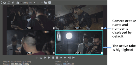 In multicamera editing mode, the Video Preview window switches into multicamera mode, with a multicamera tiled view showing the contents of all takes simultaneously. The active take is highlighted with a colored border.