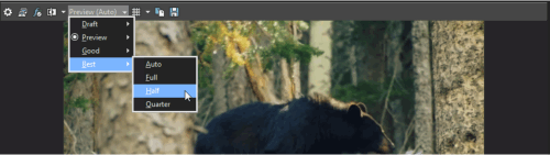 The Auto setting will adjust the frame size to fit the Video Preview window size. The Full setting processes frames at the project frame size. The Half setting processes frames at half the project frame size. The Quarter setting processes frames at one-quarter of the project's frame size. For example, if you have an NTSC (720x480) project, Half creates a 360x240 preview; Quarter creates a 180x120 preview.