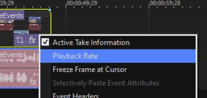 Each video event in your project has a specific duration that is not changed by adjusting the playback rate. If you decrease the speed of a ten-second video event by 50%, only five seconds of video will be shown. On the other hand, if the speed is increased 200%, the ten seconds of video will play in only five seconds. The remaining five seconds of the event will be filled either with a freeze of the last frame or with ten additional seconds of video content from the media file (if the source media is longer than the event).