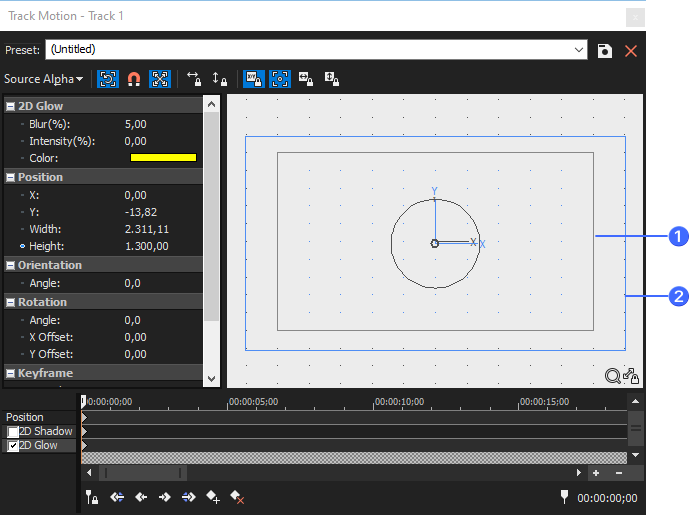 Select the 2D Glow row in the keyframe controller. When the 2D Glow row is selected, glow controls are displayed in the Track Motion dialog.