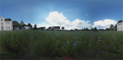 As a result of the fish-eye optics the light is quite low at the border of the picture of each lens which results in a visual vignette effect at these borders (2). Click on the triangle near Image Vignetting and adjust the Intensity and Range sliders to minimize the effect. For a comparison, you can switch off vignette removal by deactivation the Remove vignetting check box. You can additionally experiment with the parameters under Refinement for a perfect result, but in most cases this is not necessary. The image should now look like this: