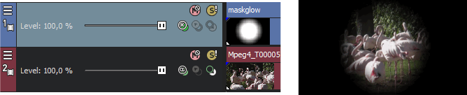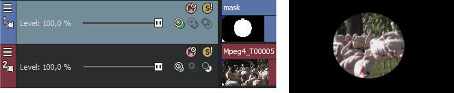 In this first example, there are three tracks. Track one contains a mask. The circular region in the mask is transparent, so the second track shows through. The third track is also a child, so it is displayed behind track two.