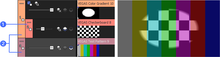 The following examples demonstrate how each of the compositing modes would affect two simple tracks. Track one is a generated media event with a transparent edge.
