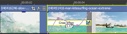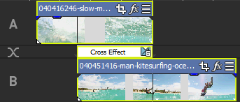 One or both of the events will be extended so they overlap, allowing room for the transition. Use the Alignment drop-down list under the Cut-to-overlap conversion heading on the Editing tab of the Preferences dialog to determine where the transition is placed. »For further information: Editing Tab